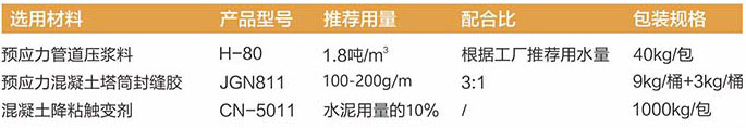 H-8 0适用于风电机组塔筒、核电站等大型工程的后张预应力混凝土孔道灌浆材料的压浆工程。 JGN811适用于风电机组预应力混凝土塔筒拼缝;桥梁预制节段拼装的胶接缝施工;